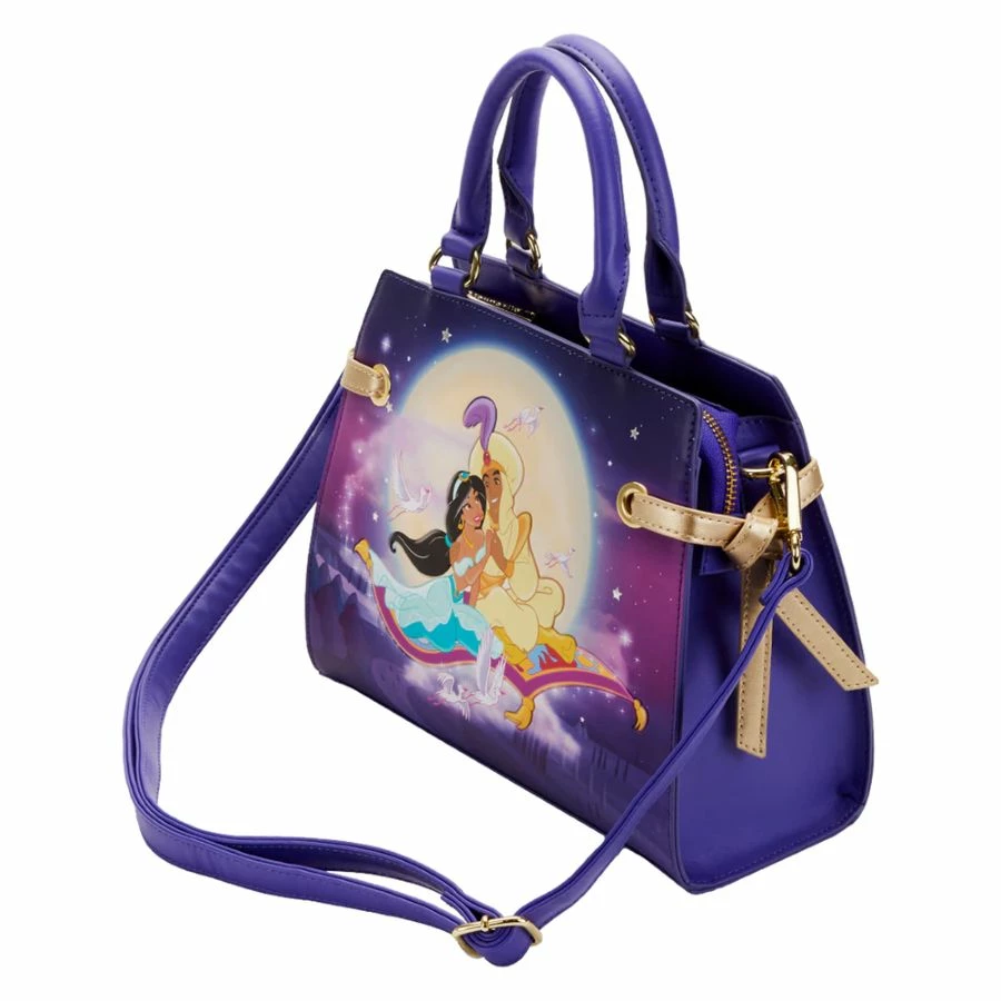 Fly away to a whole new world with this Loungefly Disney Aladdin 30th Anniversary Crossbody Bag. On the front, Aladdin and Jasmine soar through a brilliant night sky, brought to life with silver metallic stars. The moon appears in the background as Aladdin and Jasmine, in debossed detail, embrace each other on a magic carpet ride. On the back, gold metallic debossed words read. A whole new world. Gold satin bows, looped through both sides of the crossbody bag, frame the scene. It’s the perfect accessory for pairing with a Disney outfit or transforming everyday outings into magical adventures.