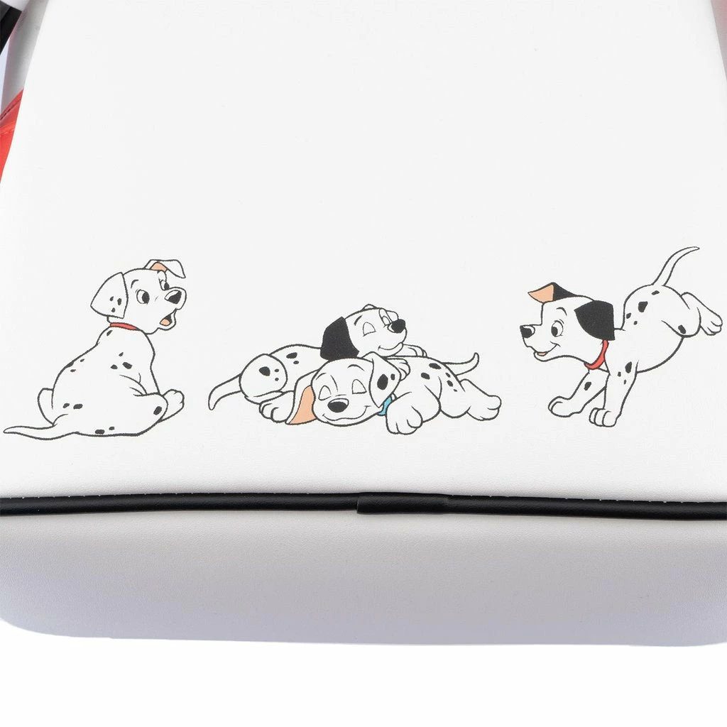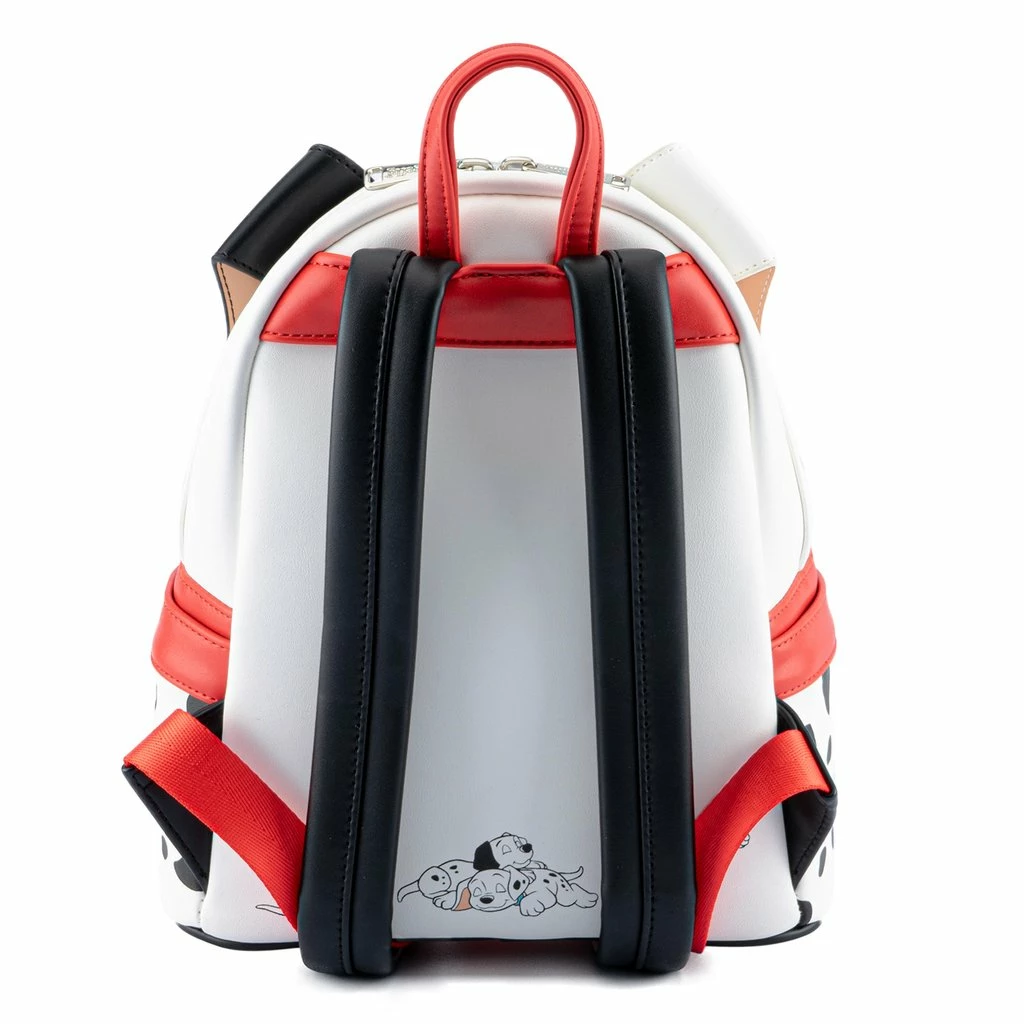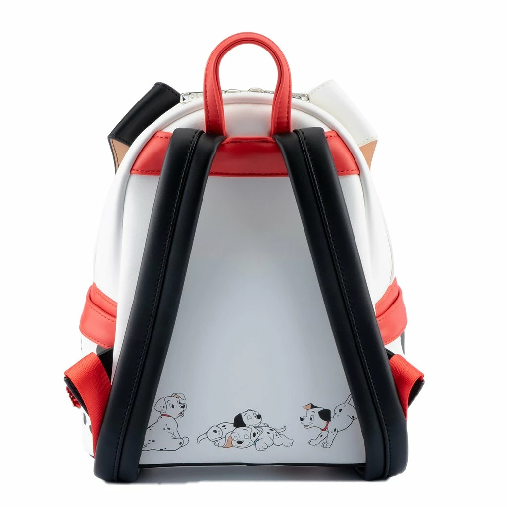 The Loungefly Disney 101 Dalmatians 70th Anniversary Cosplay Mini Backpack is made of vegan leather (polyurethane). Bag has adjustable shoulder straps, sturdy metal hardware, and features: applique, embroidered, and printed details. Take note of the coordinating pattern of the inside lining fabric.