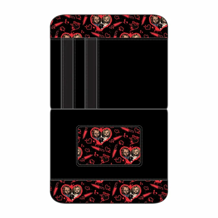 Schedule a playdate with a killer couple! Escape with the Loungefly Bride of Chucky Zip Around Wallet. On the front, Chucky and Tiffany (in her bridal outfit), pose against a black backdrop, spattered in blood. On the back, the word Chucky appears, along with a red heart with a dagger through it. Inside the wallet, there are 4 slots for holding cards and 1 clear slot for holding your ID. It’s the perfect accessory to accompany you on your daily haunts.