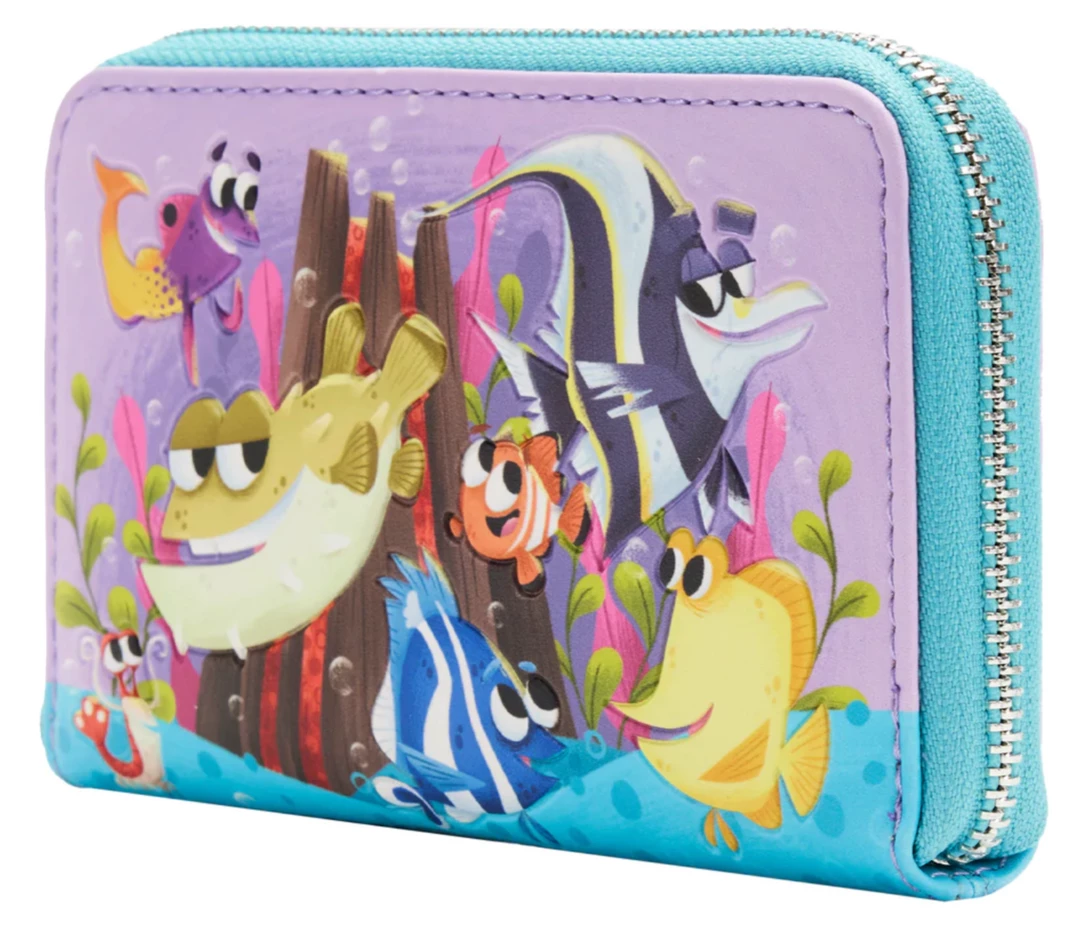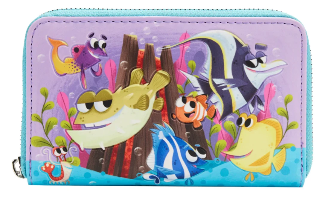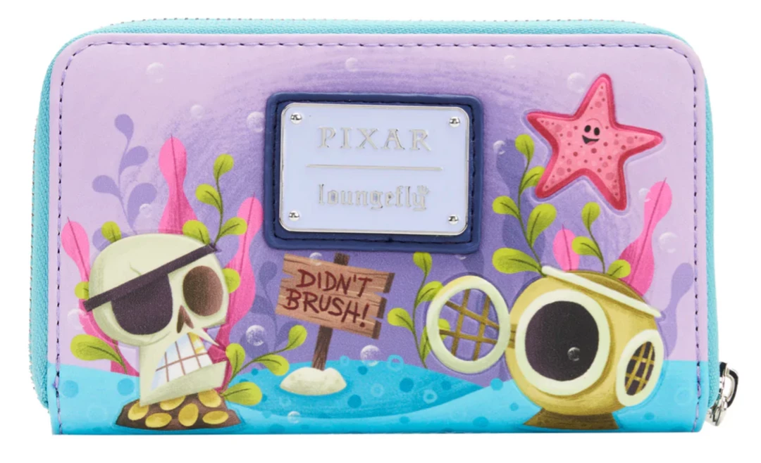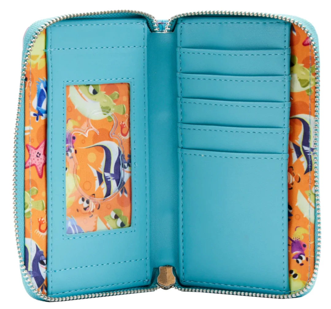 Climb atop Mount Wannahockaloogie and join Nemo’s new friends with this Loungefly Disney-Pixar Moments Finding Nemo Tank Zip Around Wallet. You’ll find Nemo, Bloat, Gill, Gurgle, Bubbles, Deb, and Jacques, brought to life in debossed detail, swimming among a sea of bubbles. On the back, Peach makes a star appearance. The pirate skull decoration and “Didn’t Brush” sign not only offer the fish a place to hide, but they’re delightfully ominous reminders of the adventures that await Nemo and his friends in Dr. Phillip Sherman’s Dentist Office. Even the copper helmet scuba diving decoration finds a place in this scene! Inside the wallet, there are 4 slots for holding cards and a clear slot for holding your ID. The clear slot even includes a die-cut Nemo-shaped window. It’s the perfect accessory for any Disney outfit—or for turning everyday outings into magical adventures.