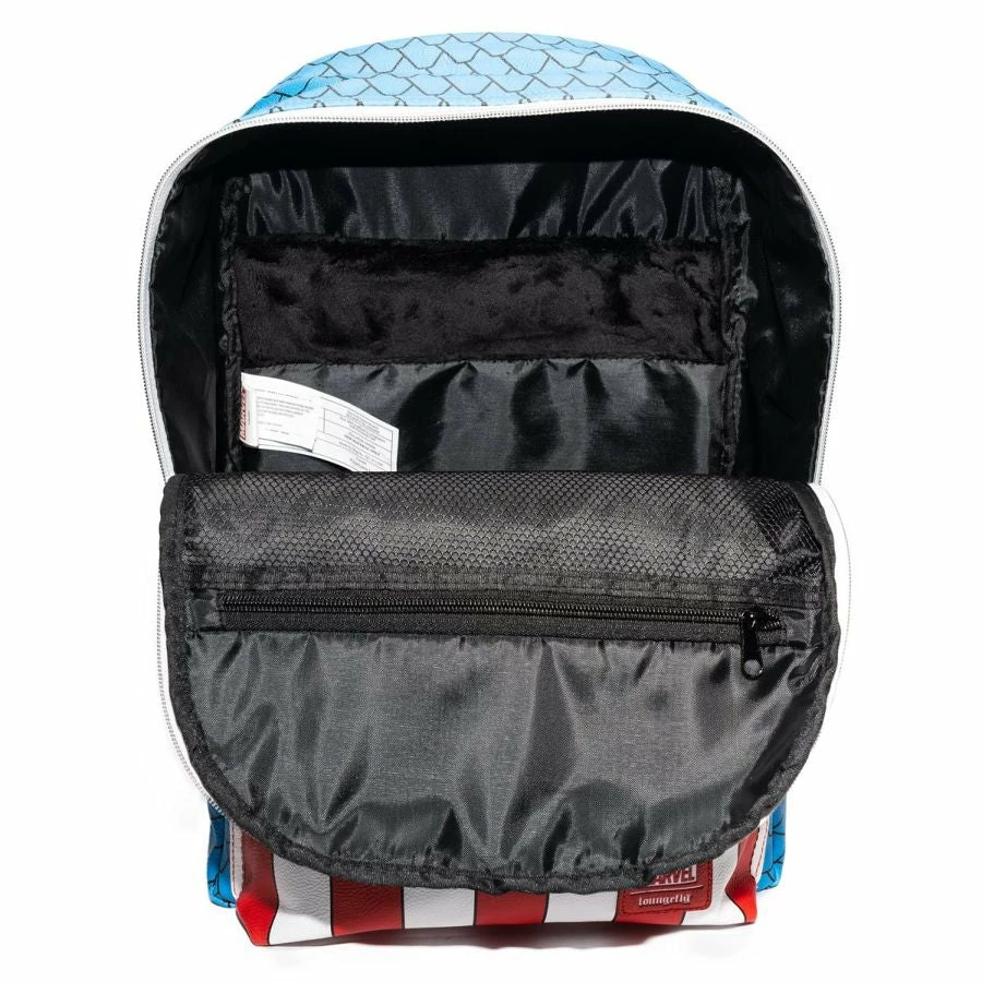 Made of faux leather, it measures about 18-inches tall x 12-inches wide x 5 1/2-inches deep and features top zipper closure, a front zippered pocket, adjustable straps, and printed details. Plus, it includes a cool 1 1/2-inch tall enamel pin!