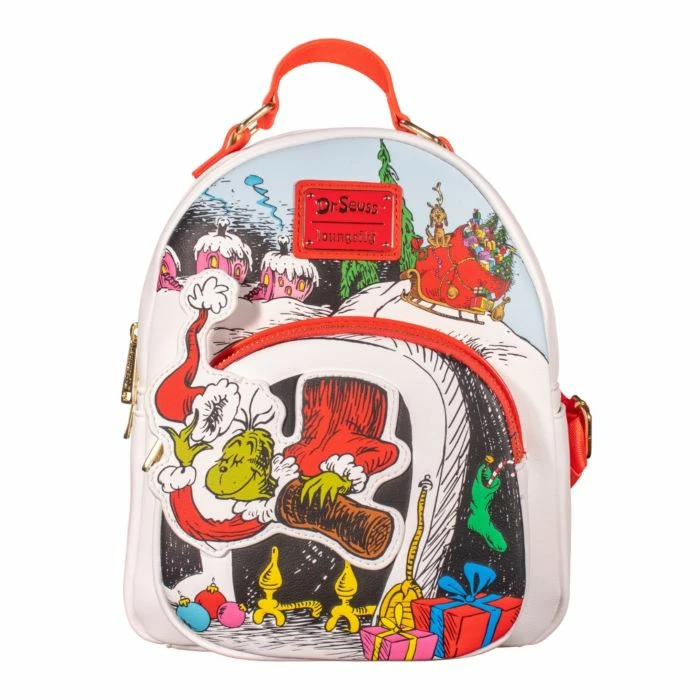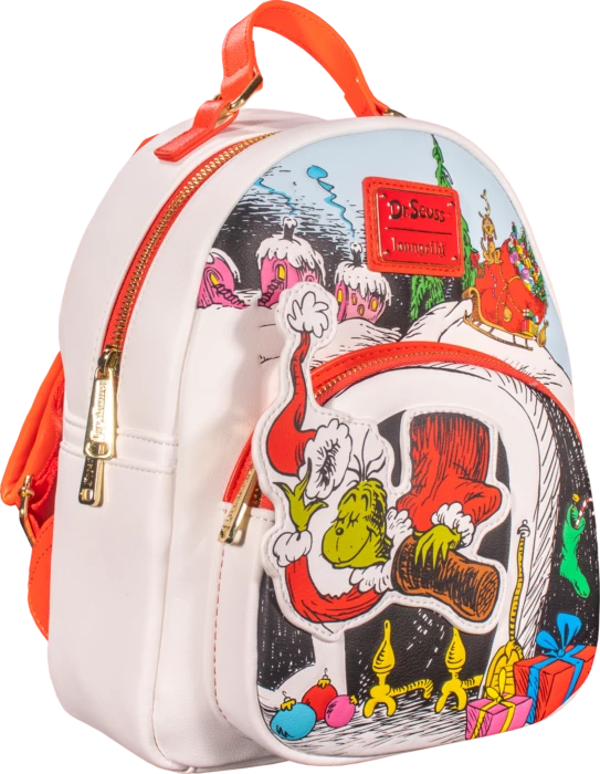 Who-ville is about to get a shock when it encounters the Loungefly Dr. Seuss The Grinch Mini Backpack. The holiday humbug is sneaking down chimneys and snagging whatever he can reach. Cindy-Lou Who is on the back of this festive bag holding a wreath. Humbugs and holiday heroes alike will love this bag.