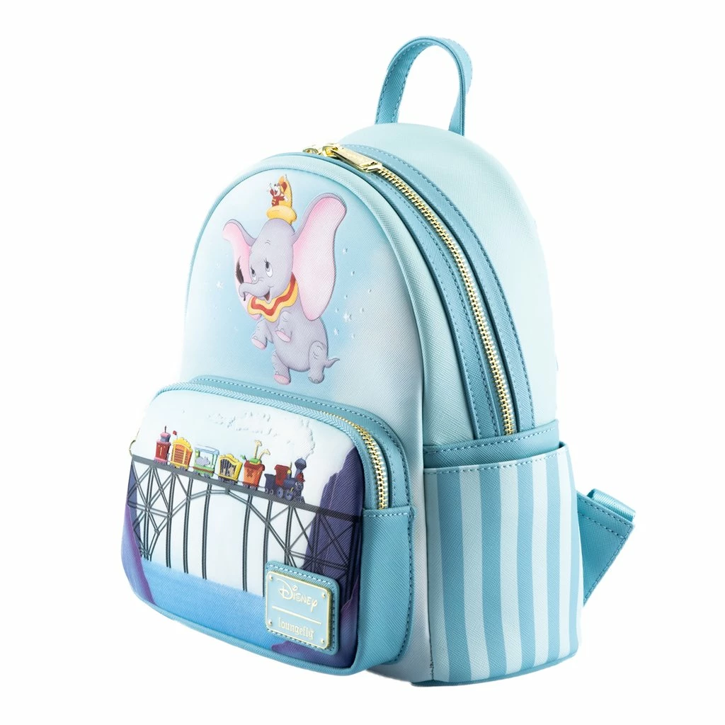 Celebrate the 80th Anniversary of Dumbo and soar with joy when you accessorize with the Loungefly Disney Dumbo 80th Anniversary Mini Backpack. The bag shows Dumbo flying over the water and past railroad bridge. Look no further for the main attraction for your Loungefly collection.