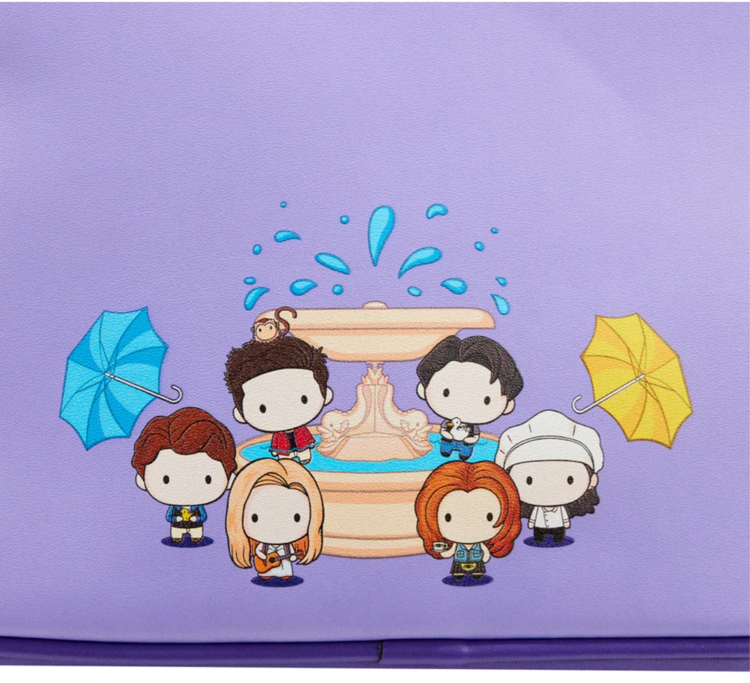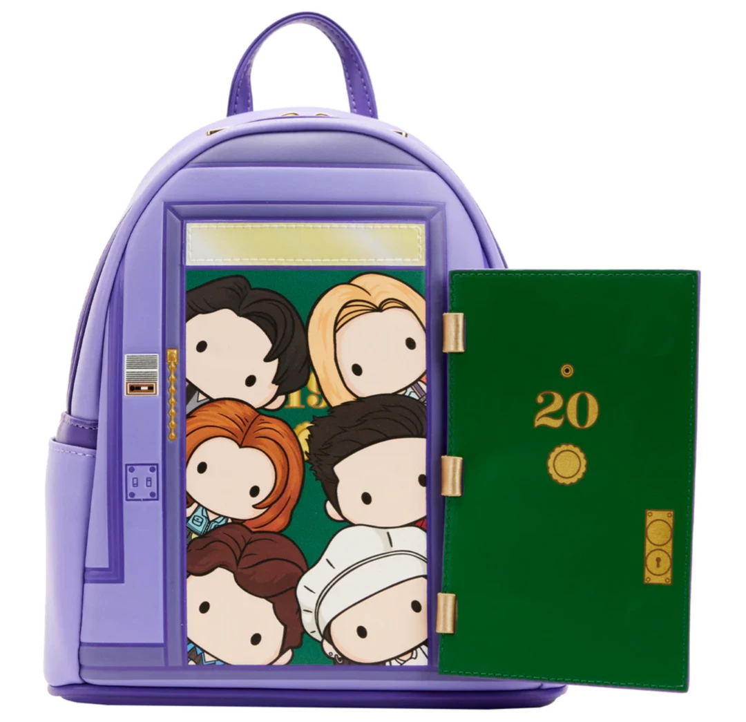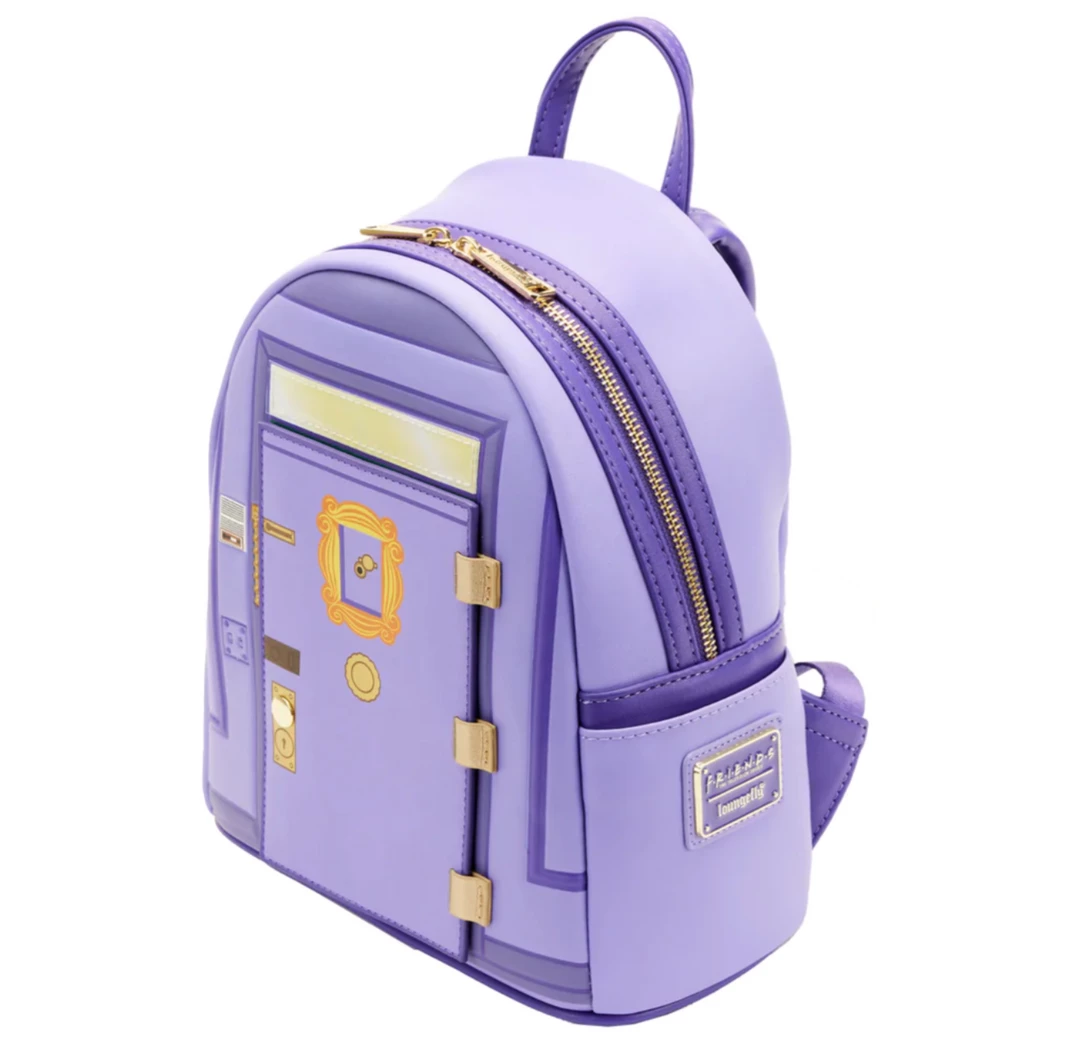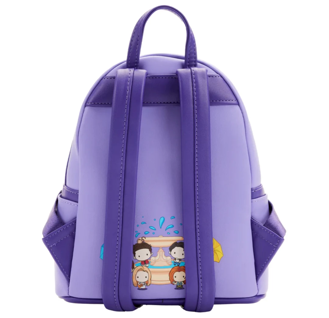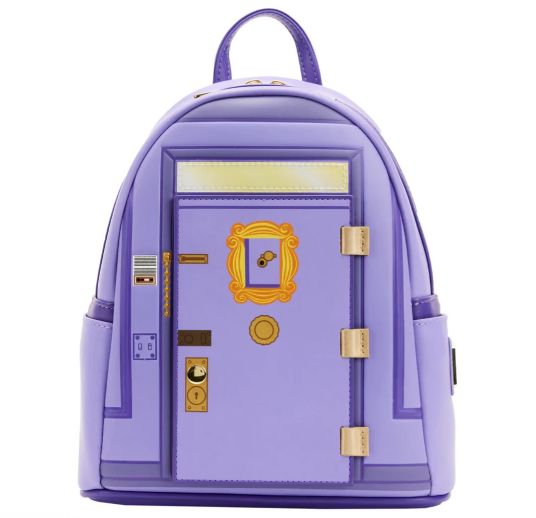 Open the door and hang out in the friend zone with the Loungefly F.R.I.E.N.D.S. Front Door Mini Backpack. On the front of this purple backpack, applique and debossed details re-create the outside of Apartment 20, including the gold frame around Monica’s apartment peephole. The doorknob actually turns on a metal rivet, and you can open the door to find all Friends inside, including Monica in her chef’s hat, Ross, Phoebe, Joey, Jennifer, and Chandler! The door inside is painted green, and you can see the number 20 in gold. On the back, all characters unite for an iconic scene around the fountain. This backpack will be there for you! It’s perfect for a day trip around town—or for turning everyday outings into fun adventures.