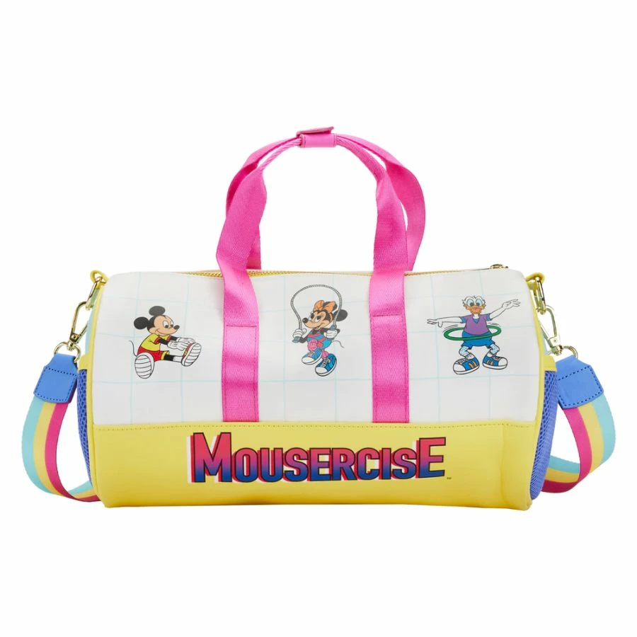 Come on everybody, it’s time to get on your feet! The Loungefly Disney Mousercise Duffle Bag is here to get you up and moving. Dressed in retro athletic wear, this 1980s-inspired mini backpack features Mickey Mouse, Donald Duck, and Minnie Mouse as they perform their favorite forms of physical activity. On one side, Mickey holds a tennis racket, Donald lifts some weights, and Minnie performs aerobics. On the other side, Mickey sits on the ground while stretching, Minnie skips with a jump rope, and Donald spins a hula hoop. The “Mousercise” logo is printed below on a yellow background.