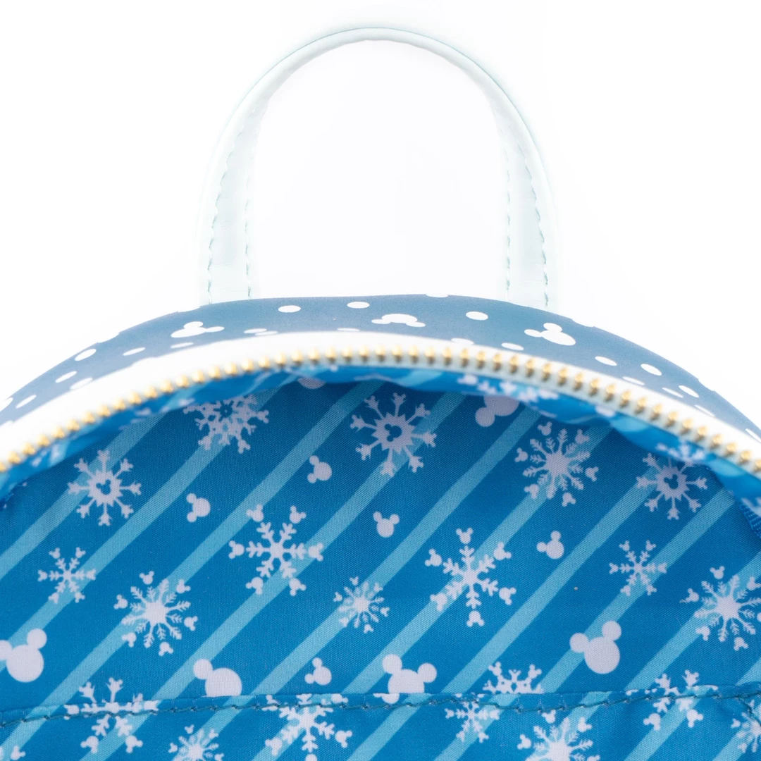 The Loungefly Disney Snowman Mickey and Minnie Mouse Snow Globe Mini Backpack is made of vegan leather (polyurethane) with PVC trim. Bag has adjustable shoulder straps, sturdy metal hardware, and features: pom pom, and printed details. Take note of the coordinating pattern of the inside lining fabric.