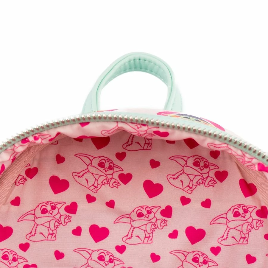 The Mandalorian Grogu Valentines Mini Backpack is made of vegan leather (polyurethane). Bag has adjustable shoulder straps, sturdy metal hardware, side pockets, and features: debossed, and printed details. Take note of the coordinating pattern of the inside lining fabric. Please note: Patterns will vary with all-over-print styles. Not every piece will look identical nor will every piece be an exact match as to what is pictured online.