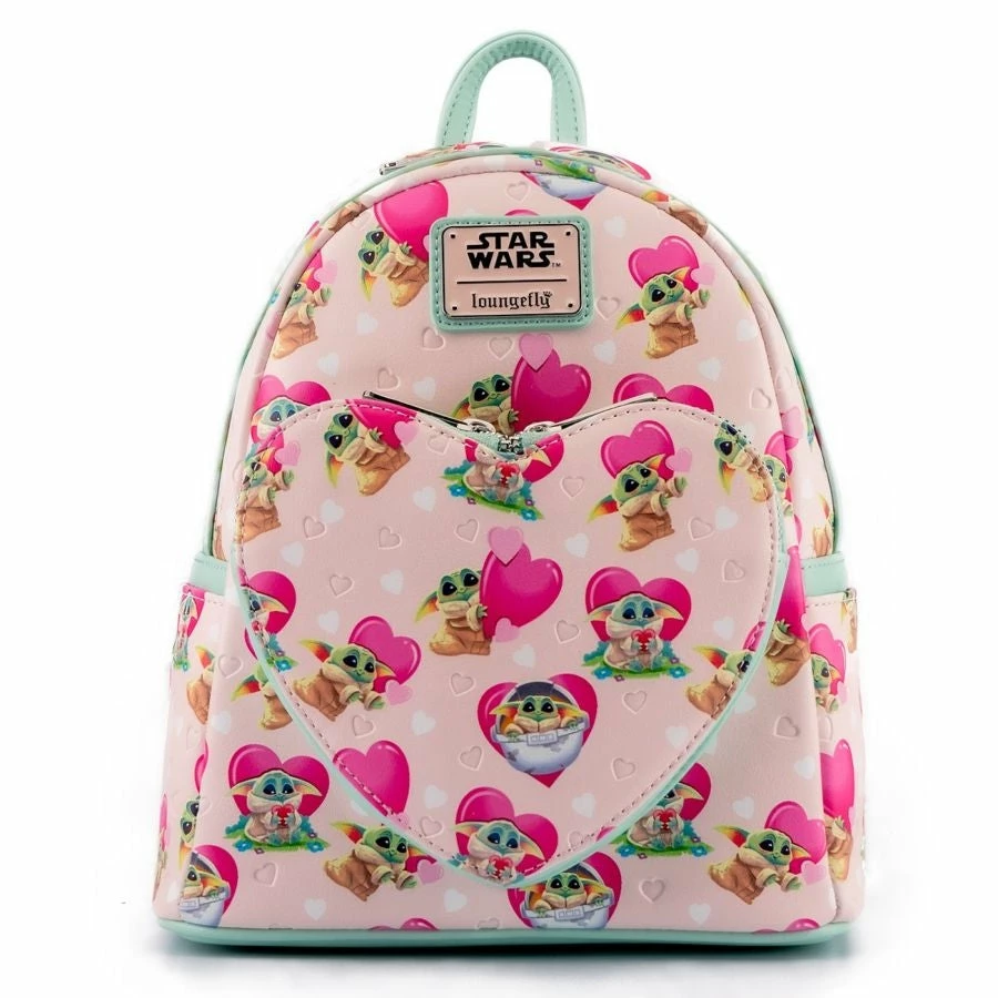 Share the love this Valentine’s Day with The Mandalorian Grogu™ Valentines Mini Backpack. The all-over-print is showered with pink and white hearts and the precious young Grogu in a variety of poses. Light green accents the pink and cream colors on various portions of the bag, such as the straps and trim. The front pocket is heart-shaped too! It’s a darling design that makes a great Valentine’s Day gift and addition to any Grogu collection.